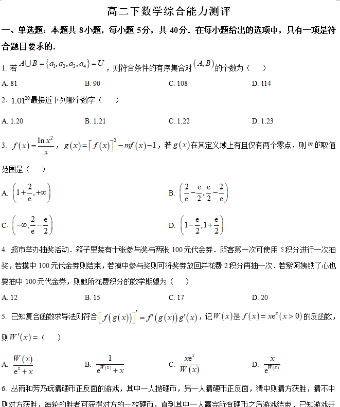 江苏100教学资源网 高二下 江苏省苏州市昆山市部分学校2023~2024学年高二下学期综合能力测评数学试卷(含解析) https://www.jiangsu100.com/8525.html