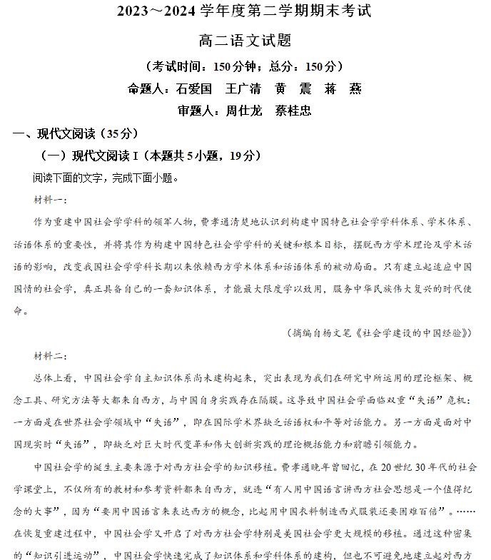 江苏100教学资源网 高二下 江苏省泰州市2023-2024学年高二下学期6月期末考试语文试题(含解析) https://www.jiangsu100.com/8606.html