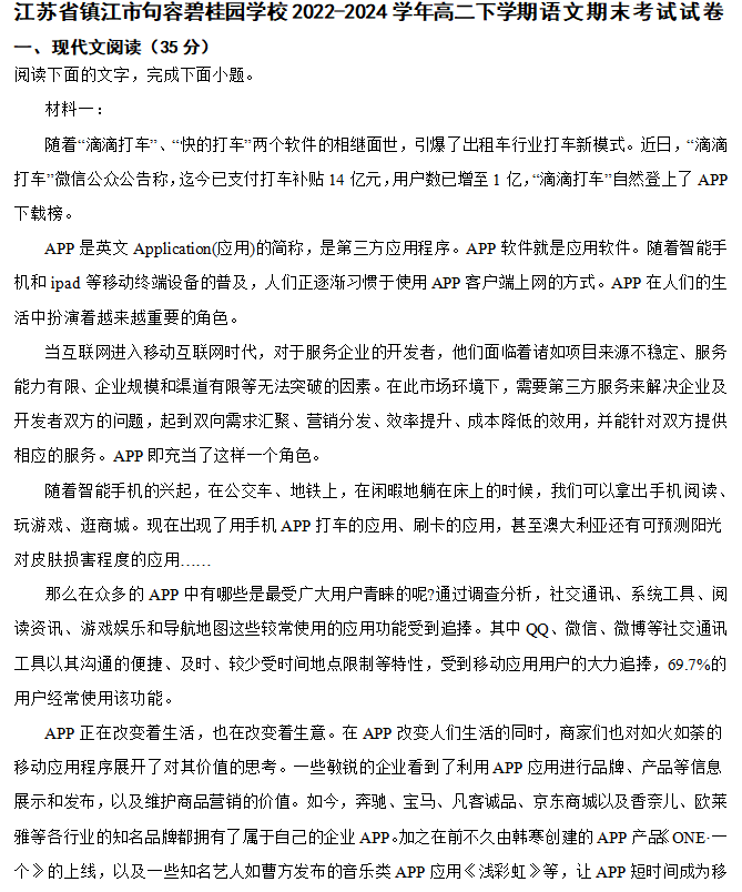 江苏100教学资源网 高二下 江苏省镇江市句容碧桂园学校2023-2024学年高二下学期语文期末考试试卷(含解析) https://www.jiangsu100.com/8654.html