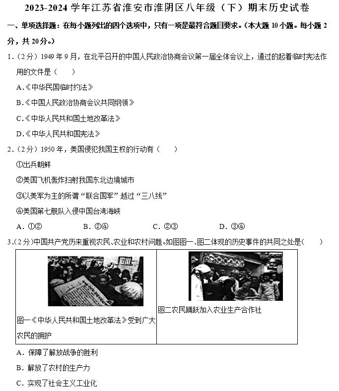 江苏100教学资源网 八下 江苏省淮安市淮阴区2023-2024学年部编版八年级下学期期末历史试卷(含解析) https://www.jiangsu100.com/9574.html